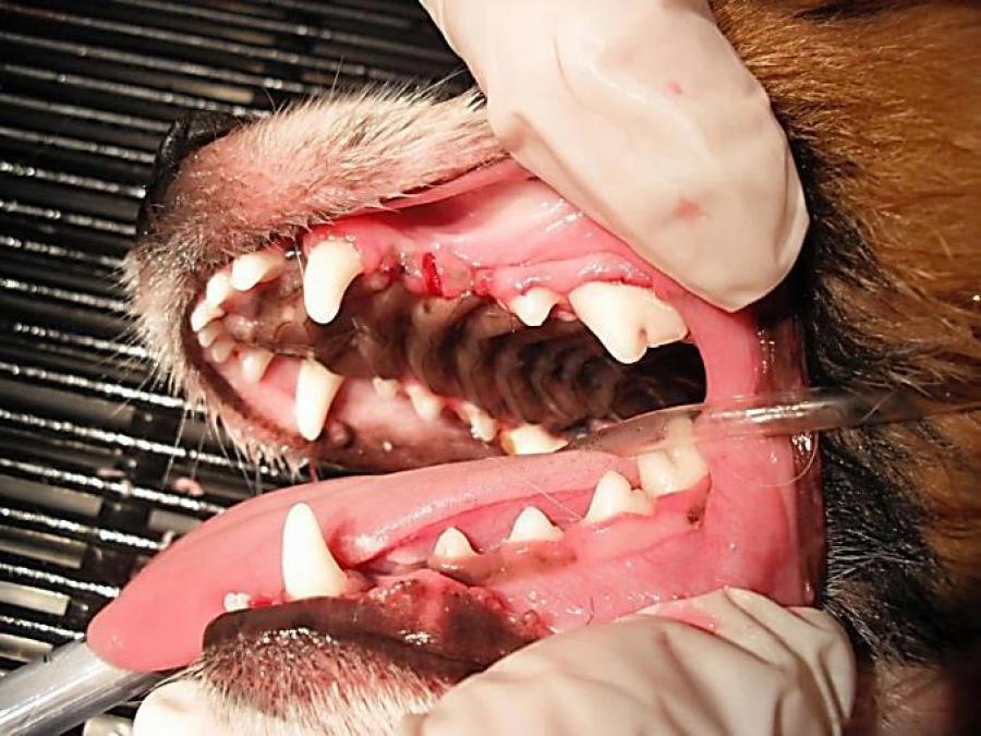 This dog had significant tartar covering most of his teeth. Due to the severity of periodontal disease that invaded the root tissue, multiple tooth extractions were required.